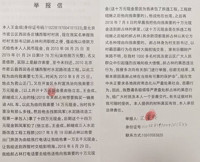 村书记郝占林长期索贿勒索,村民致信区委书记余卫国要求彻查