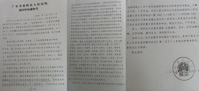 本人申诉时提交了两份足以推翻原判决的核心证据——梅州市人力资源和社会保障局《请求明确原农村劳动力转移培训政策实施过程中有关问题的函》(梅市人社函〔2017〕169号)及广东省人力资源和社会保障厅的官方复函。这两份证据是政策制定机关作出的权威解释,明确蕉岭县的农村劳动力培训工作是在省、市指导下依法开展,通过省、市验收及第三方审计,根本不存在所谓“犯罪事实”。