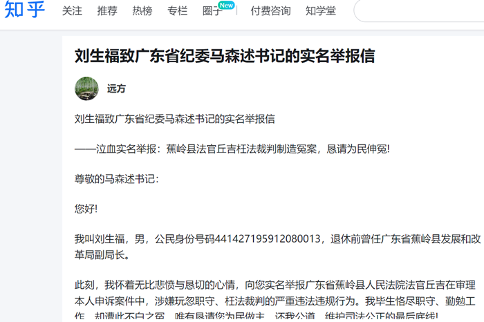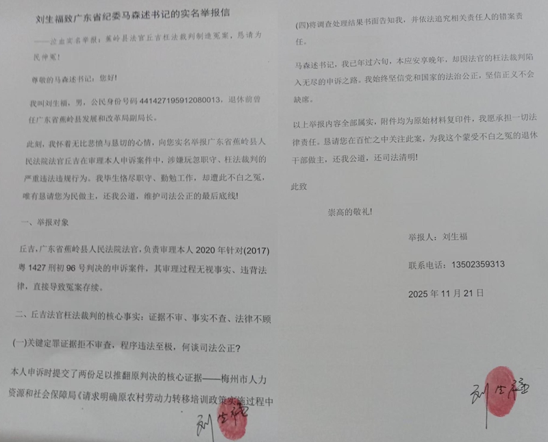 刘生福致广东省纪委马森述书记的实名举报信 泣血实名举报:蕉岭县法官丘吉枉法裁判制造冤案,恳请为民伸冤! 尊敬的马森述书记: 您好! 我叫刘生福,男,公民身份号码441427195912080013,退休前曾任广东省蕉岭县发展和改革局副局长。 此刻,我怀着无比悲愤与...
