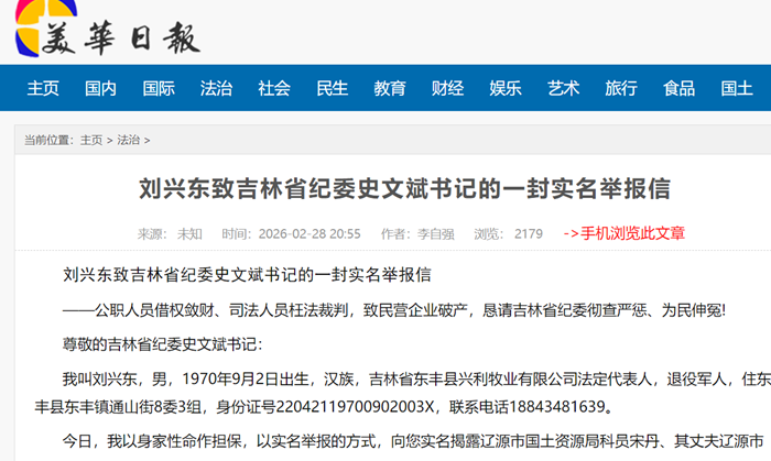 刘兴东致吉林省纪委史文斌书记的一封实名举报信 公职人员借权敛财、司法人员枉法裁判,致民营企业破产,恳请吉林省纪委彻查严惩、为民伸冤! 尊敬的吉林省纪委史文斌书记: 我叫刘兴东,男,1970年9月2日出生,汉族,吉林省东丰县兴利牧业有限公司法定代表人...