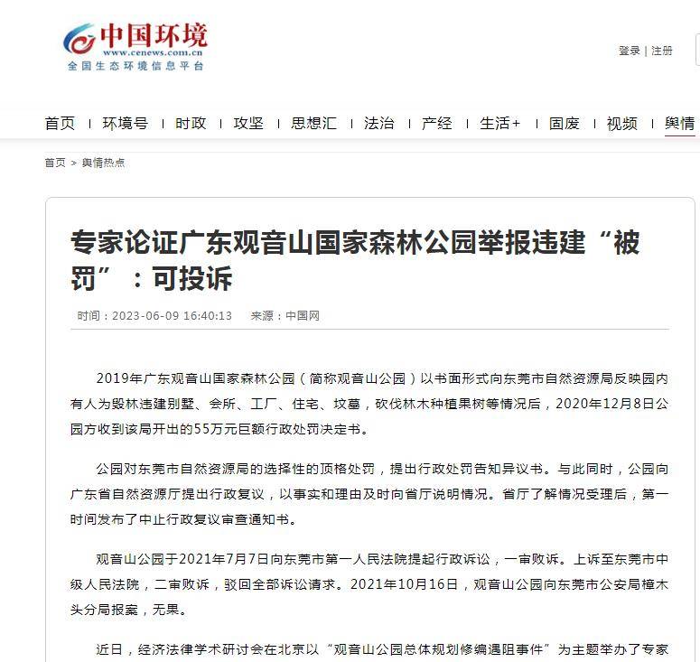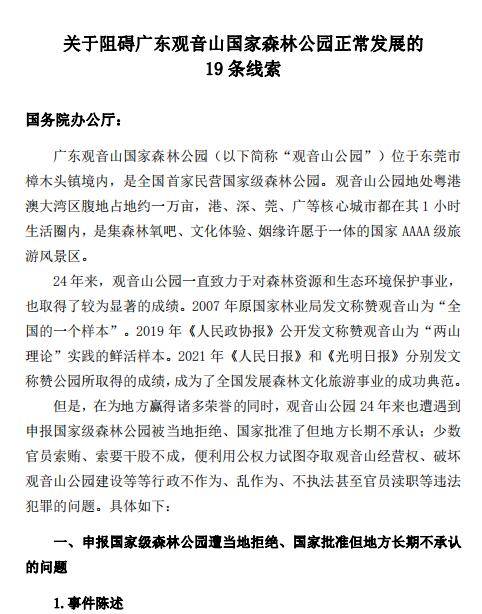 2023年8月8日,广东观音山国家森林公园向国务院办公厅致函反映阻碍正常发展的19条线索