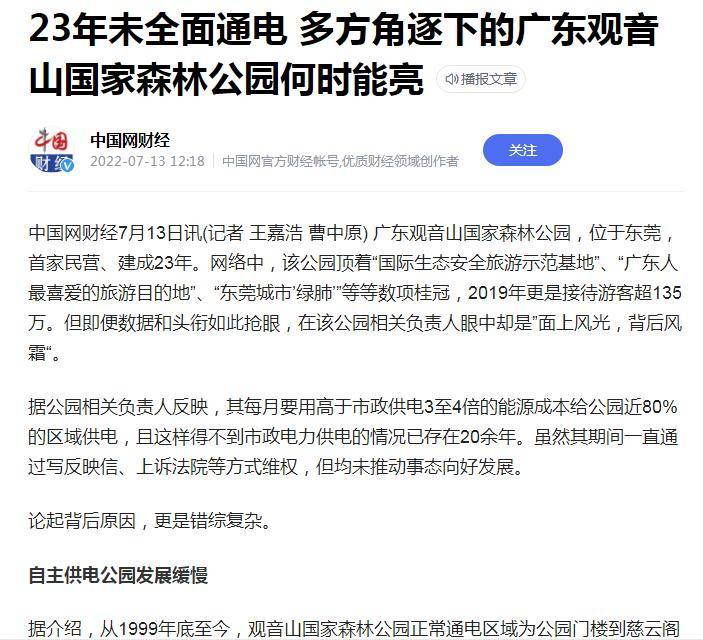 2020年12月22日央视《谈事说理》栏目播出专题“《谈事说理》之搁浅的公园”其中就着重谈到观音山国家森林公园悬而未决的基本供电问题。