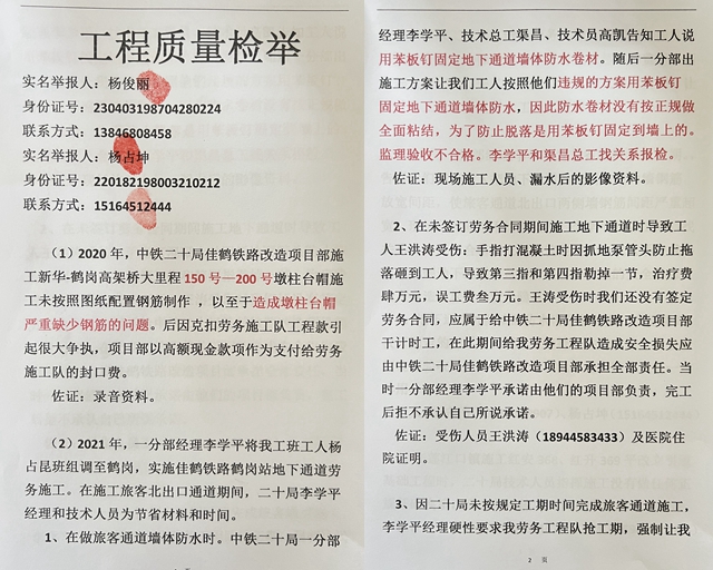 此外,杨永余等人还反映了李学平等项目工作人员克扣下属工班并索要好处费等诸多问题。记者了解到,此前,杨永余等人已将举报材料递交给中铁二十局集团及佳木斯市铁路指挥部。但目前还没有收到反馈信息。