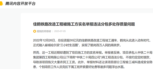 2022年12月26日,总投资超30亿元的佳鹤铁路改造工程竣工通车,鹤岗从此进入动车时代,正式融入省城哈尔滨三小时生活圈,实现了鹤岗百万人民的高铁梦。 然而,这一工程近期却遭到了项目施工方的实名举报。举报者反映,项目承包人中铁二十局集团第四工程有限公...