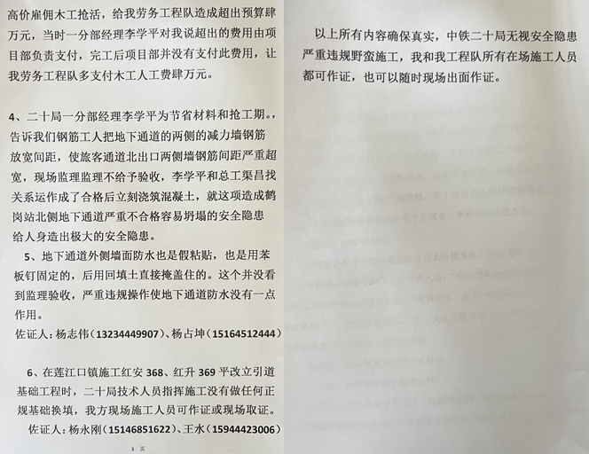 此外,杨永余还反映,项目存在偷工减料问题,并给知情者付了高额的封口费。2020年,中铁二十局佳鹤铁路改造项目部在施工新华-鹤岗高架桥墩柱多处未按照图纸配置钢筋,造成多处桥墩柱严重缺少钢筋,后来因为克扣劳务施工队工程款,施工队负责人手里掌握了材料,项目部最终全数付清了劳务款,并用高额现金支付给劳务施工队作为封口费。