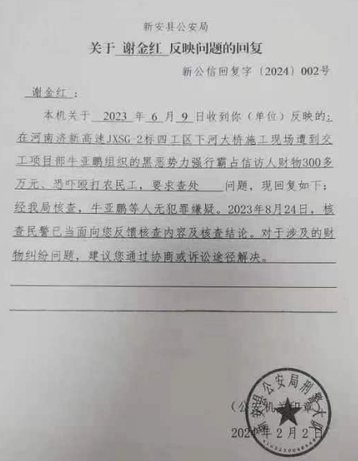 无奈之下谢开始向各单位反映信访希望得到公平处理。2023年5月30日,谢用书信向河南省公安厅反映其遭遇诉求。23年6月9号日,洛阳市公安局电话通知谢已接到省厅转交材料,并先后组织召开专项会议交刑警队查办。刑警队一郭姓警官对谢金红及部分工人进行了询问并做了笔录。但是后来,谢多次找到郭警官却一直被告知正在调查。2023年8月6日,郭警官问谢同不同意协商解决?谢答:可以。我只要要回我辛苦应得的钱,多一分也不要。郭警官说,我给领导汇报一下召集主管单位交通局、济新高速公司、交工项目部开一个协调会,解决后再写一份谅解书。谢答,可以。期间,谢多次电话询问结果,均被告知工作忙遭推辞。没有想到的是,24年1月8日,郭警官告知谢可以去工地现场清点被占物品了,已经协调牛亚鹏同意拉走了,在当天下午在郭警官带领下,长达七个月后谢再次来到工地现场,看到整个大桥已经基本完工,自己建造的板房等大多财物已经被使用坏,机械、电缆、电箱、工具、机具等确实在现场,郭警官要求谢将财物拉走,谢此时才明白自己的财物之所以能“顺利”拉走,是因为工程已经基本结束,没有使用的价值了。对此事,谢向媒体反映时也觉得反常,在8号,谢特意邀请媒体律师到工地,记者在现场的确见证了工程已经基本结束,工人已经离场,冰箱水电还正常在使用,郭警官联系牛亚鹏,牛指派人员与谢金红清点财物,物品的确有被使用过迹象。在财物清点现场会议中,郭警官明确告知谢下一步事件一件一件的进行解决。然而在随后,谢再次找到郭警官时,郭警官却突然让谢找交通局解决了,他这里的工作结束了,谢有要求郭警官出具书面告知书被拒,同时对牛亚鹏等人是否构成侵占财物避而不答,让谢向新安县公安信访部门反映。