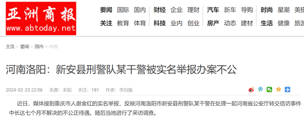 近日,媒体接到重庆市人谢金红的实名举报,反映河南洛阳市新安县刑警队某干警在处理一起河南省公安厅转交信访事件中长达七个月不解决的不公正待遇。随后当地进行了采访调查。