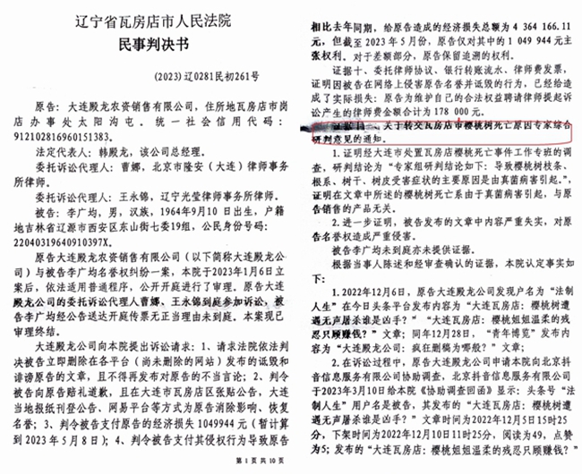 李广军向媒体介绍:2022年12月6日前后,因一位辽宁一家官方媒体老记者所求,他在自己管理的网站上转发了今日头条、腾讯等媒体刊发的关于瓦房店樱桃树大面积死亡事件的报道。第三天,即12月8日,大连殿龙农资销售有限公司(简称:大连殿龙)即与他联系删贴,因稿件所涉证据确凿,而大连殿龙并没有提供有力证据而未能删除,他万万没有想到大连殿龙竟然暗中起诉他名誉侵权!