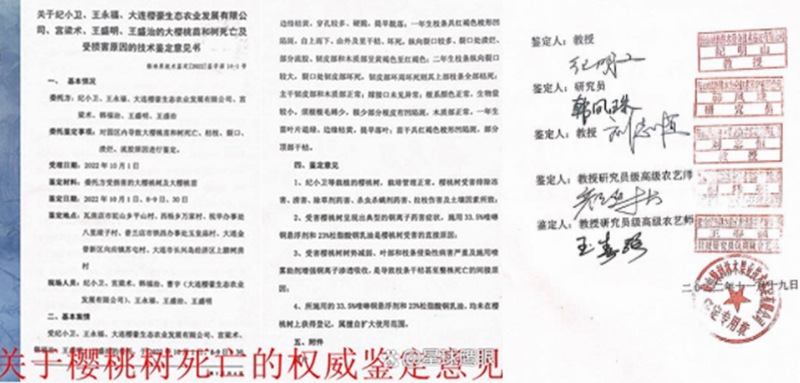 与此相反,令人感到不可思议的是,高兴利作为独审法官,却对没有任何机构盖章、没有任何专家签字承认的一张废纸十分认同。该判决书称:“2023年5月6日,大连市处置瓦房店樱桃死亡事件工作专班组织西北农林科技大学、北京市农林科学院、山东省农业科学院等单位7位专家组成专家组对樱桃树死亡原因开展研判,专家组根据现场考察情况、鉴定试验和测试报告,出具《关于瓦房店市樱桃树死亡原因专家综合研判意见》(简称《研判意见》),研判结论为导致樱桃树枝条、根系、树干树皮受害症状的主要原因是由真菌病害引起。”高并据此判决李广军构成名誉侵权。目前,这份《研判意见》早已在网上被骂的狗血喷头,在多家媒体的报道中均能看到,是一个没有任何机构盖章承认,也没有任何专家签字认账的废纸,被广大农户和律师们认为是假证、伪证,是大连市农业农村局为了袒护大连殿龙出具的遮羞布!目前,受害的广大农户还在不断的维权,不断的要求严惩大连市农业局相关官员。