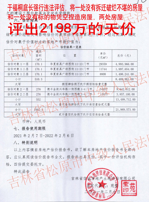 更令人震惊的是评估环节。据德卡公司提供的证据显示,银行原址其中一处华夏棚户区2007年至今已经18年扶余住建局(政府)没有拆迁完,导致银行起诉。现房产已"破败不堪、无商业价值",另一处因政府拓宽道路被占没。于福桐庭长对于扶余住建局(政府)是拆迁主体问题不予认定,却单方委托的评估公司给出了"天价结论",回迁协议变成天价现金补偿:华夏棚户区门市一层单价达29359元/平方米,在没有标的物的情况下竟凭空评出一层单价34937元/平方米,两处房产评估总价高达2198万余元,远超同地段新建商铺均价。
