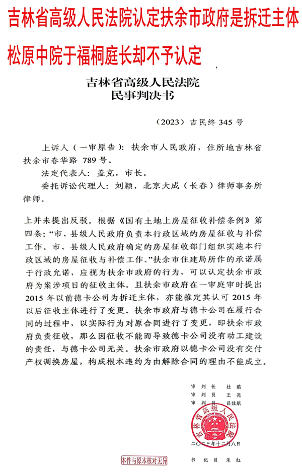 "我们企业先后遭遇:松原中院于福桐庭长违法评估,将吉林银行回迁协议变成天价现金补偿。在疫情期间仅欠息30万,吉林银行松北支行就申请强制执行,法院将价值2个亿的资产超标的查封,之后银行纳入不良资产将债权出售。2007年的华夏棚户区,扶余市住建局至今仍有10户没有拆完,导致已经迁走的11户至今不能“回家”,吉林银行的两起案件均因扶余市住建局没有完成拆迁而引起。企业因此举步维艰、濒临倒闭。我们不怕困难,怕的是司法不公和扶余市住建局不作为。"德卡公司负责人的话语中带着疲惫,却透着坚持,"国家的好政策不能被地方歪风消解,我们维权到底,就是要讨回一个公平,追究相关人员的法律责任。