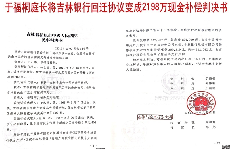 "这不是评估,简直是明抢!"德卡公司负责人愤怒地表示,协议明确约定"回迁安置",法官却强行变更为"货币补偿",且评估价与实际价值严重背离。德卡公司直指,法官于福桐的判决完全站在银行立场上,"相当于用司法权帮银行撕毁合同,再逼我们用高价买自己早已备好的回迁房"。最终,法院依据该评估结果判决德卡公司支付2198万余元现金(案号(2019)吉07民初114号),导致企业直接损失超千万元。