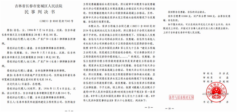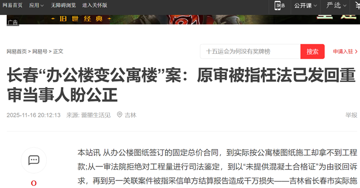 本站讯 从办公楼图纸签订的固定总价合同,到实际按公寓楼图纸施工却拿不到工程款;从一审法院拒绝对工程量进行司法鉴定,到以未提供混凝土合格证为由驳回诉求,再到另一关联案件被指采信单方结算报告造成千万损失吉林省长春市实际施工人侯惠敏与长春市天泽房...