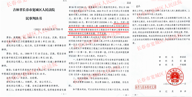 本站讯 从办公楼图纸签订的固定总价合同,到实际按公寓楼图纸施工却拿不到工程款;从一审法院拒绝对工程量进行司法鉴定,到以“未提供混凝土合格证”为由驳回诉求,再到另一关联案件被指采信单方结算报告造成千万损失——吉林省长春市实际施工人侯惠敏与长春市天泽房地产开发公司(下称“天泽公司”)的工程款纠纷,历经一审程序后陷入“维权困境”。如今,多家媒体曝光后,随着长春市中级法院以“事实不清”为由将其中一案(7343号)发回重审,侯惠敏终于看到了维权的曙光,她感谢法官的公正履职与检察机关的监督支持,期待重审能还自己一个公道。