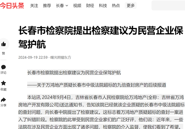长春市检察院提出检察建议为民营企业保驾护航 关于万鸿地产质疑长春市中级法院超标的九倍查封房产的后续报道 本站讯 2024年9月4日,吉林省长春市人民检察院给万鸿地产(全称:吉林省万鸿房地产开发有限公司)送达通知书,告知该院已经就该企业质疑的长春市中级...