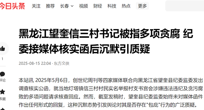 本站讯 2025年5月6日,创世纪周刊等四家媒体联合向黑龙江省望奎县纪委监委发出调查核实公函,就当地灯塔镇信三村村民实名举报村支书宫会涉嫌违法违纪及贪污腐败的多项问题请求核查回应。然而,截至发稿时,望奎县纪委监委始终未对媒体函件作出任何形式的回复,这种沉默态势引发舆论对其是否存在"包庇"行为的广泛质疑。