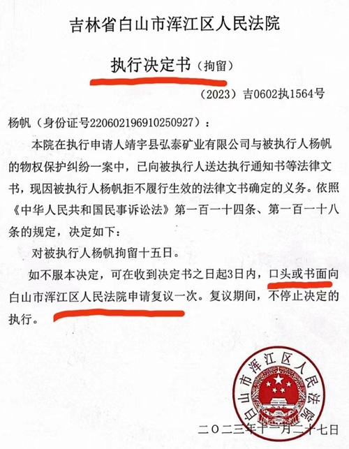 浑江区法院的(2021)吉0602民初2875号判决书生效后,苏刚等人申请执行,浑江区法院遂以(2023)吉0602执1564号执行通知书开始执行。但是,杨帆认为2875号案认定事实错误,已通过律师依法向吉林省高级法院申请再审,并于11月17日立案,她同时还提出执行异议,而浑江区法院的法官却对此并未理会。不仅如此,该法院的法官还逼着杨帆交出矿山的所有证照,遭到杨的严词拒绝。浑江区法院遂于2023年11月27日,对杨帆做出(2023)吉0602执1564号执行决定书(拘留),将杨帆行政拘留15天,并冻结了杨帆所有的银行卡和微信支付。而该决定书违反了《中华人民共和国民事诉讼法》第119条之规定,交待申请复议机关错误,法官擅自篡改法条,将当事人不服拘留决定可以向上级法院申请复议改为向本院申请复议,杨帆向法官寻求合理解释时,法官竟以“笔误”为由敷衍了事。杨帆说:法官身为执法者,代表了国家的司法形象,法官的行为决定人民对法律及司法机关的信任,该法官肆意篡改法律条文且态度恶劣,在办案过程中始终带有极端的情绪,其背后原因不得不让人深思。