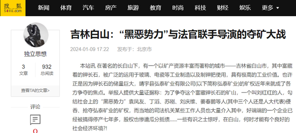 本站讯 在著名的长白山下,有一个以矿产资源丰富而著称的城市——吉林省白山市,其中富藏着的钾长石,被广泛的运用于玻璃、电瓷等工业制造以及制钾肥使用,具有极高的工业价值。也许正是因为钾长石的储量巨大,靖宇县弘泰矿业有限公司(以下简称弘泰矿业)的矿权近年来就成了各方争夺的焦点。举报人提供大量证据称:为了争夺这个富藏钾长石的矿山,一个叫刘红红的人,勾结社会上的“黑恶势力”袁凤友、丁滔、苏刚、刘庆维、姜春鹏等人(其中三个人还是人大代表)侵吞、抢夺弘泰矿业的矿权,而当地的司法机关某些工作人员也大量介入其中,好端端的一个企业已经被搞得停产七年多,股权也惨遭瓜分抵债......一些有识之士惊呼,在白山,何时才能有个良好的社会经济环境?!