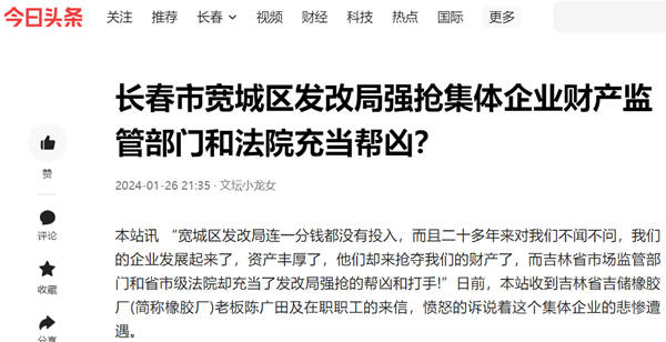 本站讯 宽城区发改局连一分钱都没有投入,而且二十多年来对我们不闻不问,我们的企业发展起来了,资产丰厚了,他们却来抢夺我们的财产了,而吉林省市场监管部门和省市级法院却充当了发改局强抢的帮凶和打手!日前,本站收到吉林省吉储橡胶厂(简称橡胶厂)老板...