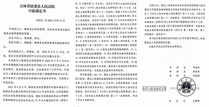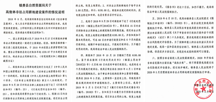 郝亚洲在举报信里称:2010年未,高俊林未经国土资源管理部门批准,擅自占用镇赉县街北村集体耕地1239.07平方米建设车库,所建车库及其他用房设施最晚于2016年6月出售完毕。其占用的耕地内就有我的9眼水源井,高俊林于2016年2月份盗窃其井内设施,买通镇赉县公安局中一些人,未对其立案侦查,之后他更加嚣张,就在井上盖车库出售。于是,郝亚洲2018年6月将此事反映到镇赉县自然资源局,但是由于镇赉县自然资源局法规监察科科长胡晓强出具的材料中申请执行的行为主体不够全面,没有确定已售出车库的所有人,法院未支持其强制执行的行政行为,镇赉县法院第一次裁定不予强制执行。胡晓强故意包庇高俊林,明知主体人员不全面还要故意申请法院强制执行,导致申请被驳回。在接到法院裁决后,胡晓强不改正其行政行为,反而提出复议,申请白城市中级法院裁定,结果是2020年7月28日中级法院作出的裁定书(2020)吉08行审复2号再次驳回复议申请,维持原裁定。到了2022年,镇赉县法院终于做出裁定,准予镇赉县自然资源局强制拆除高俊林的违法建筑,可是至今也没有人组织拆除。