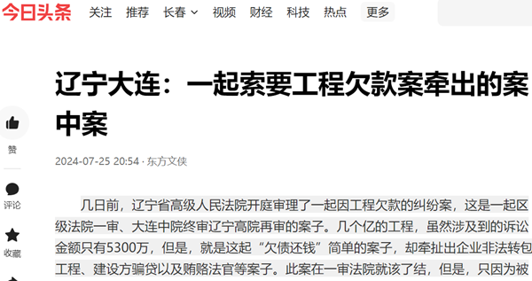 几日前,辽宁省高级人民法院开庭审理了一起因工程欠款的纠纷案,这是一起区级法院一审、大连中院终审辽宁高院再审的案子。几个亿的工程,虽然涉及到的诉讼金额只有5300万,但是,就是这起欠债还钱简单的案子,却牵扯出企业非法转包工程、建设方骗贷以及贿赂...