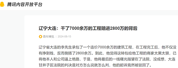 辽宁省大连的李先生承包了一个造价7000余万的建筑工程,在工程完工后,他不仅没有挣到钱,反而倒搭了2800余万。到此,他觉得这转包给他工程的商家太黑太狠,已将他本人和公司逼上绝路,于是,他将最后的一线曙光指望在了法院,没成想,大连甘井子区法院的判...