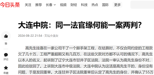 高先生挂靠在一家公司干了一个脚手架工程,在结算时,不仅合同约定的工程款欠了几十万,工程严重超期又有几百万,在这些欠款对方都不认可的情况下,高先生以本人的名义,起诉到了辽宁大连市甘井子区法院,法院一审认为高先生身份不对,因此给驳回了。上诉到大连市中级法院,大连中院认为这活是高先生干的,身份没有问题,于是发回重审。大连甘井子区法院重审后认定了高先生的身份,并确认了55万元的欠款,但没有确认工程超期部分的欠款,对此判决,双方都不服,共同上诉到大连中院,这回,大连中院对高先生的身份及欠款全不认可,将甘井子区法院重审的判决全给撤销了,于是高先生懵了,同一家法院,同一位法官,同一个案子,怎么事隔两年却下了截然相反的判决?其背后的原因到底是什么?接到举报,记者对此展开调查采访。
