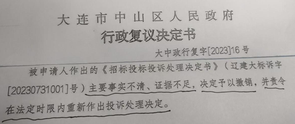 大连泛华为自己维权走的第一步是,到本次招标的甲方也就是大连老虎滩公司,对方的回答是:“本次招标全部依照招标文件规定标准进行评审的”,意思是无一点不当之处。第二步到本次招投标主管部门大连市中山区财政局,这家政府部门做出了《招标投标投诉处理意见书》,结论是与老虎滩公司一样一样的,无奈之下,只好到中山区政府走行政复议之路。中山区政府通过调查了解,针对区财政局的《决定书》下了这样的结论:“主要事实不清、证据不足,决定予以撤销”,并责令区财政局“在法定时限内重新作出投诉处理决定”。中山区财政局真的重新作了决定,但再次作出的决定与第一次是一样一样的,这是我国的《行政复议法》第六十四条中明令禁止的,可是,中山区财局就这样做了。