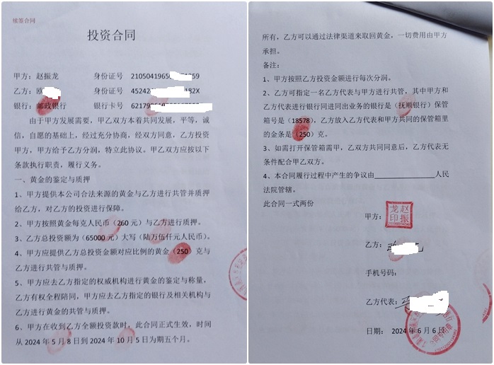 本站讯 近日,辽宁省沈阳36金业赵振龙及其公司沈阳市浑南区叁拾陆珠宝销售行因被指涉嫌合同违约、逃避责任,引发了广泛的社会关注。 多名投资人向媒体提供证据并称:赵振龙及其公司以实物黄金质押银行保险箱共管的形式与投资者签订了投资合同,该投资形式在...