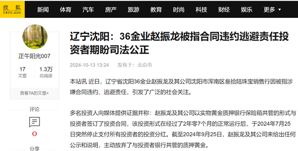 36金业的发展过程也备受关注。据介绍,赵振龙在两年半的时间内共开设了四家企业,包括沈阳市大东区腾博金银珠宝行、沈阳市浑南区叁拾陆珠宝销售行等。他以国家政策藏金于民、宣传打造中国北方黄金交易所的旗号,让投资者看到了希望。尤其是他以现货黄金260元/克的超低价格质押与投资者银行共管,更是吸引了大量投资者的关注。然而,从2024年7月25日开始,赵振龙及其公司却违反了合同约定,停止支付投资者的投资分红。