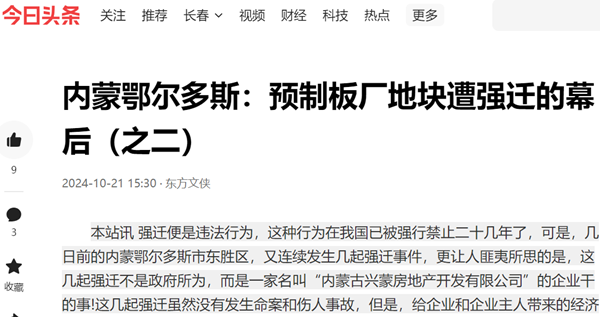 本站讯 强迁便是违法行为,这种行为在我国已被强行禁止二十几年了,可是,几日前的内蒙鄂尔多斯市东胜区,又连续发生几起强迁事件,更让人匪夷所思的是,这几起强迁不是政府所为,而是一家名叫内蒙古兴蒙房地产开发有限公司的企业干的事!这几起强迁虽然没有...