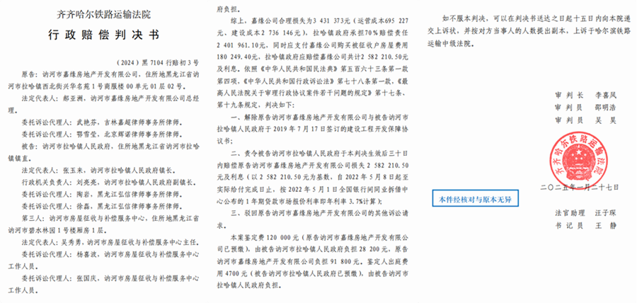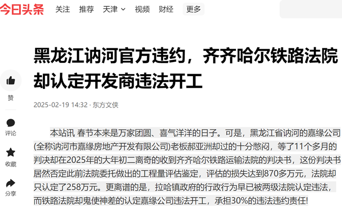 本站讯 春节本来是万家团圆、喜气洋洋的日子。可是,黑龙江省讷河的嘉缘公司(全称讷河市嘉缘房地产开发有限公司)老板郝亚洲却过的十分憋闷,等了11个多月的判决却在2025年的大年初二离奇的收到齐齐哈尔铁路运输法院的判决书,这份判决书居然否定此前法院委托做出的工程量评估鉴定,评估的损失达到870多万元,法院却只认定了258万元。更离谱的是,拉哈镇政府的行政行为早已被两级法院认定违法,而铁路法院却鬼使神差的认定嘉缘公司违法开工,承担30%的违法违约责任!