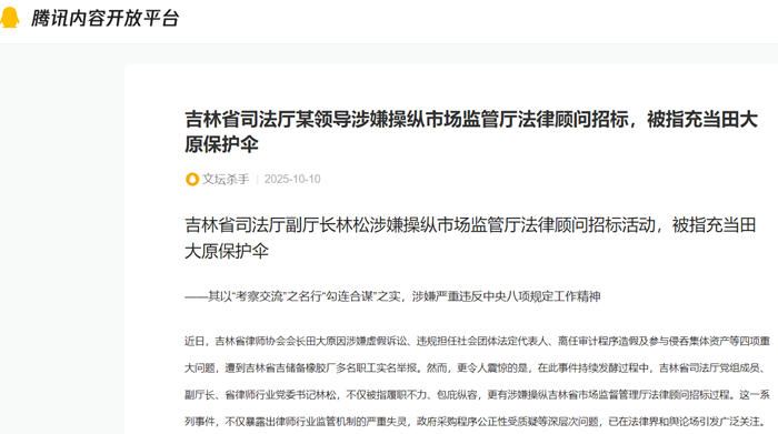 根据最新披露的举报材料与可查证的公开信息,吉林省司法厅副厅长林松被指在吉林省市场监督管理厅法律顾问招标过程中存在严重不当干预行为,具体情节涉及程序公正与利益关联等多重问题,已构成一个完整的疑点链条。