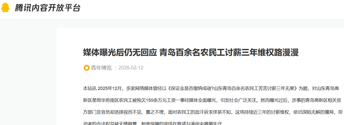 本站讯 2025年12月,多家网络媒体曾经以《保证金是否缴纳成谜?山东青岛百余名农民工苦苦讨薪三年无果》为题,对山东青岛高新区星雨华府南区农民工被拖欠150余万元工资一事经媒体全面曝光,引发社会广泛关注。然而曝光过后,涉事的青岛高新区相关官方部门及官...