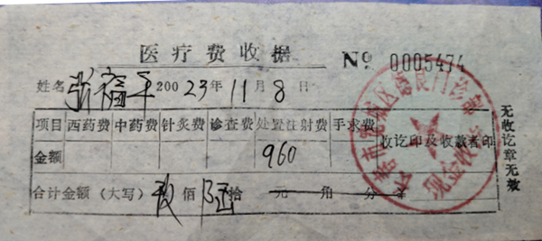 图为:张福平在德良诊所看病的医疗费收据