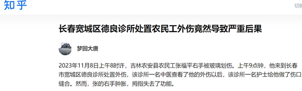 2023年11月8日上午8时许,吉林农安县农民工张福平右手被玻璃划伤。上午9点钟,他来到长春市宽城区德良诊所处置外伤,该诊所一名中医查看了他的外伤以后,该诊所一名护士给他做了伤口缝合。然而,张的右手肿胀,拇指失去了功能。
