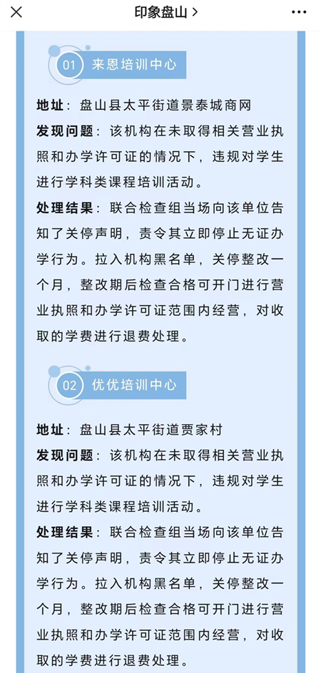 实际上,盘山县自“双减”政策以来,一直都存在大量非法学科类补课现象,在2022年1月份盘山县公众号‘印象盘山’就通报过盘山县来恩培训中心、优优培训中心、厚朴培训中心、卜卜绘本馆等多家教培机构在未取得相关营业执照和办学许可证的情况下,违规对学生进行学科类课程培训活动的通报。
