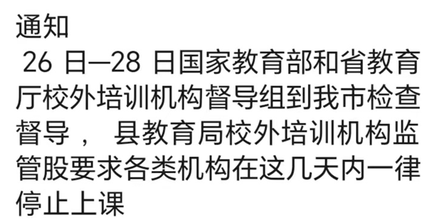“通知:26日—28日,国家教育部和省教育厅校外培训机构督导组到我市检查督导,县教育局校外培训机构监管股要求各类机构在这几天内一律停止上课。”7月25日,辽宁省盘山县各教培机构微信群和电话接到如上通知,而在24日到30日,盘山县辖区各教培机构不仅停业,一些非法学科类补课机构和个人也纷纷停止非法补课。