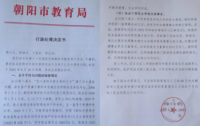 辽宁省朝阳市教育局2025年9月24日出具的《行政处理决定书》载明:英德学校理事长张文奎在2019年12月到2024年5月期间未在学校,未构成利益关联人,利益关联交易是否公允经咨询省级律师:朝阳英德学校并未重新组织第三方评估,教育行政部门无法确定是否公允;关于投诉教育局越权干预问题答复,英德学校仍沿用2022年的临时章程和《议事规则》,均不具备法律效力,学校属于违规运营。2025年3月26日,朝阳英德学校陈维忠等四位理事,在未依法履行临时会议召集程序的情况下,强行召开理事会临时会议解聘和聘任校长,并于当日微信告知市区两级教育行政部门,强行为新聘任校长备案,并未向审批机关提供必要的任职备案要件和学校决策机构出具的备案请示。经咨询省级律师,给出的答复是:临时理事会程序不正当、结果不正当,不须出具书面答复;关于关于违法剥夺学校聘请律师权利问题答复:市指导组征得学校各位理事同意,积极协调聘请市域外律师,由市司法局在沈阳筛选15名省内有声望的律师,但英德学校各位理事未达成聘用沈阳律师的决议。2025年2月,朝阳市龙城区法院下达了(2025)辽1303民初9号判决书,3月3日,市教育局、龙城区教育局组织开英德学校问题协调会,六位理事到场,市、区教育局同意英德学校上诉,具体上诉方式由英德学校理事会决定。会后,校长张凤良积极推动英德理事开会研究,但各位理事就聘请律师一事无法达成一致意见,未及时上诉;关于涉嫌滥用职权问题答复不属实:2025年4月7日,市信访联席会议议定:调整换届指导小组,选派临时负责人,要求学校完成党支部的换届,选举理事会职工代表,完善学校理事会,解聘和聘任校长,保障学校正常秩序。但因相关利益人频繁举报投诉,导致上述工作推进缓慢,无法顺利完成;关于违法干预民办学校内部事务不属实,陈维忠等四名理事未通过合法程序罢免理事长张文奎,选举陈维忠为董事会临时负责人。学校未就此事向市、区两级教育部门提请有法律依据的请示,市、区两级教育局也未做出任何决议。
