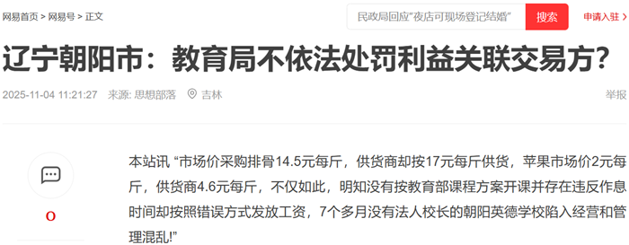 本站讯 “市场价采购排骨14.5元每斤,供货商却按17元每斤供货,苹果市场价2元每斤,供货商4.6元每斤,不仅如此,明知没有按教育部课程方案开课并存在违反作息时间却按照错误方式发放工资,7个多月没有法人校长的朝阳英德学校陷入经营和管理混乱!”