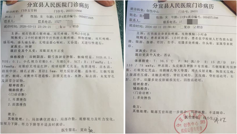 据受害学生家长袁先生反映,2026年3月11日21时10分许,分宜县第五中学初一年级(10)班的袁姓学生在晚自习结束后,遭到同校初一年级(11)班林姓学生的蓄意报复。