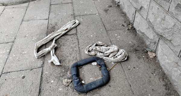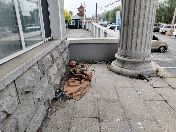 图为:四平市殡仪馆正门窗口下遗弃的旧衣物
