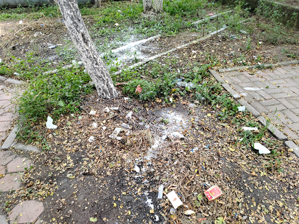 图为:四平市殡仪馆殡仪服务部院内垃圾遍布下树林下