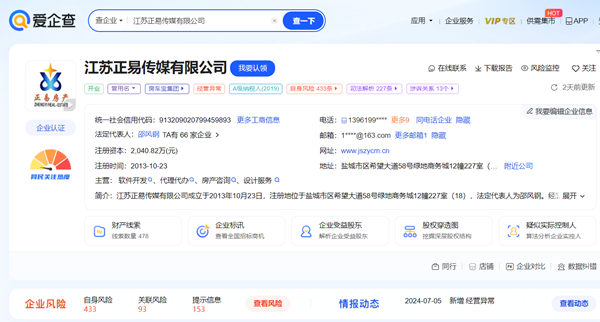 爱企查显示,江苏正易传媒有限公司(以下简称正易传媒)是一家成立于2013年10月23日的企业,注册地址是盐城市区希望大道58号绿地商务城12幢227室(18),法定代表人是邵风钢。不知什么原因,爱企查提示该企业风险很多,其中:自身风险433个,关联风险93个,提示...