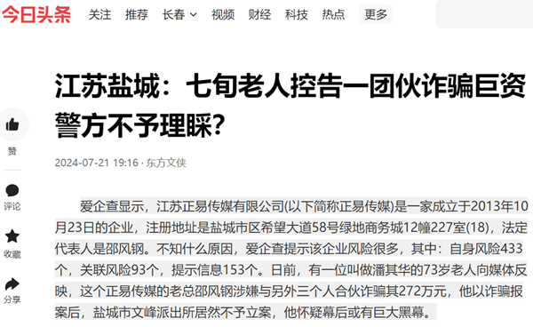 爱企查显示,江苏正易传媒有限公司(以下简称正易传媒)是一家成立于2013年10月23日的企业,注册地址是盐城市区希望大道58号绿地商务城12幢227室(18),法定代表人是邵风钢。不知什么原因,爱企查提示该企业风险很多,其中:自身风险433个,关联风险93个,提示信息153个。日前,有一位叫做潘其华的73岁老人向媒体反映,这个正易传媒的老总邵风钢涉嫌与另外三个人合伙诈骗其272万元,他以诈骗报案后,盐城市文峰派出所居然不予立案,他怀疑幕后或有巨大黑幕。