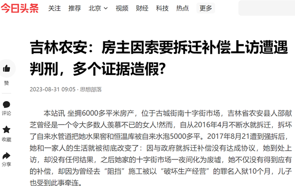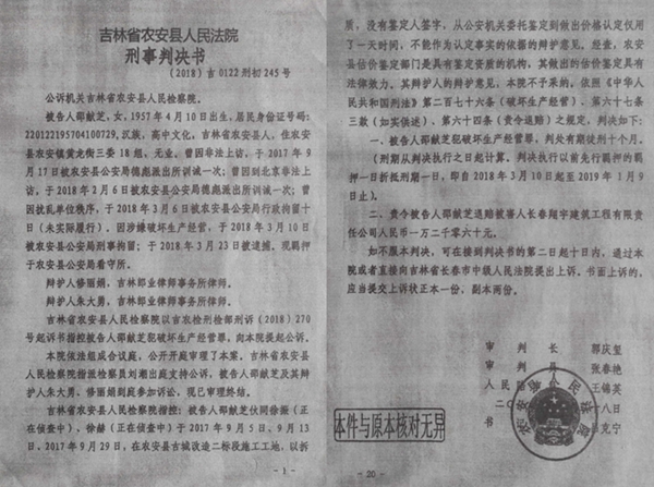 邵献芝家住农安县农安镇,和老伴徐贵超曾经做过多年的生意,早在1992年,他们就出资买下了农安县房产经营公司的一处临街商品房,2003年10月又通过企业改制购买了位于古城街东侧农安县果莱食杂公司的土地,登记发证面积为6258平方米。但是,从2016年4月起,她家水果窖进了大量自来水,甚至泡倒了水果窖和恒温库,她找自来水公司多次也没有任何结果。到了2017年8月17日,农安县住房和城乡建设局给邵献芝夫妇发通知称,县政府决定对古城街全线进行升级改造,并已经于7月20日全面开工,但因在补偿问题上没有与政府达成协议,加上房屋被水侵泡,邵献芝走上了上访之路。因为自己家就在工地旁边,2017年9月15日,她顺道路过工地时,与施工方发生过争执,最终被以“破坏生产经营”的罪名被判入狱10个月。对于此事,农安县法院(2018)吉0122刑初245号刑事判决书是这样记述的: