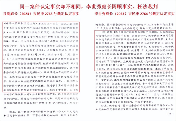 李世秀庭长承办另外的101户,德卡公司已提出反诉解除代租合同,李世秀庭长认定的事实却截然相反。2023年10月25日,吉林省高级人民法院(2023)吉民申2764号民事裁定书第19页称:“本院经审查认为:(三)案涉《德卡城市广场代租合同》不应解除”:1、虽然新冠疫情确实对实体经济有影响,但德卡公司、德卡扶余分公司在原审中没有提交任何证据证明德卡城市广场无法继续经营,又未与魏东等101人协商达成一致即擅自将德卡城市广场关闭,现又要求解除代租合同,原审判决未予支持并无不当。2、德卡公司、德卡扶余分公司要求解除代租合同,魏东等101人辩称,代租合同与认购协议系关联合同,如解除代租合同应一并解除认购协议。经查,2014年6月,德卡扶余分公司与魏东等101人签订代租合同,同时签订了认购协议,且认购协议约定“交付业户自行经营时间是2027年12月31日”,该时间恰是代租合同期满时间,故德卡公司、德卡分公司仅要求解除代租合同,本院不予支持。”