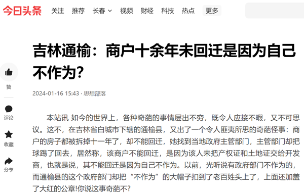 本站讯 如今的世界上,各种奇葩的事情层出不穷,既令人应接不暇,又不可思议。这不,在吉林省白城市下辖的通榆县,又出了一个令人匪夷所思的奇葩怪事:商户的房子都被拆掉十一年了,却不能回迁,她找到当地政府主管部门,主管部门却把球踢了回去,居然称,该商户不能回迁,是因为该人未把产权证和土地证交给开发商,也就是说,其不能回迁是因为自己不作为。以前,光听说有政府部门不作为的,而通榆县的这个政府部门却把“不作为”的大帽子扣到了老百姓头上了,上面还加盖了大红的公章!你说这事奇葩不?