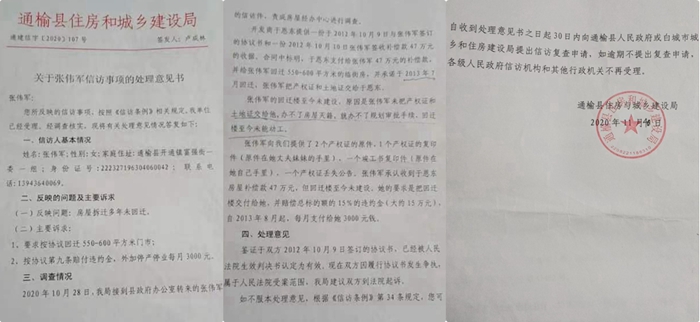 据张伟军提供的通榆县住房和城乡建设局《关于张伟军信访事项的处理意见书》(通建信字2020第107号)证明:因为自己的房屋被拆后一直未能回迁,张伟军曾经多次向当地政府反映问题,但问题始终未能得到解决,住建局反而把责任推到了张伟军自己身上,其做出的信访处理意见书称: