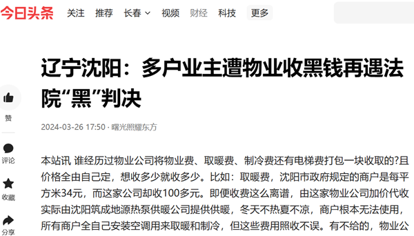 本站讯 谁经历过物业公司将物业费、取暖费、制冷费还有电梯费打包一块收取的?且价格全由自己定,想收多少就收多少。比如:取暖费,沈阳市政府规定的商户是每平方米34元,而这家公司却收100多元。即便收费这么离谱,由这家物业公司加价代收实际由沈阳筑成地源...
